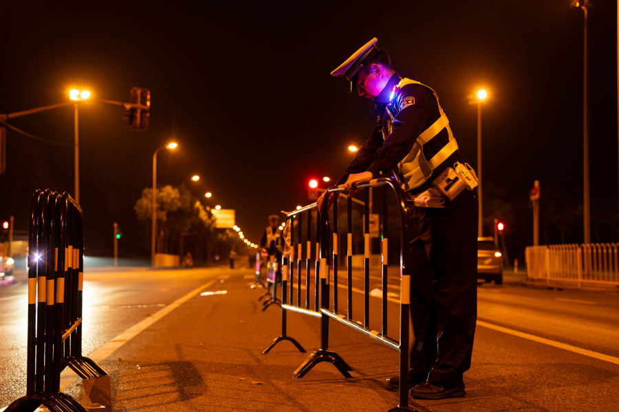 闵行公安分局交管支队四大队民警在路中协助布设铁马隔离