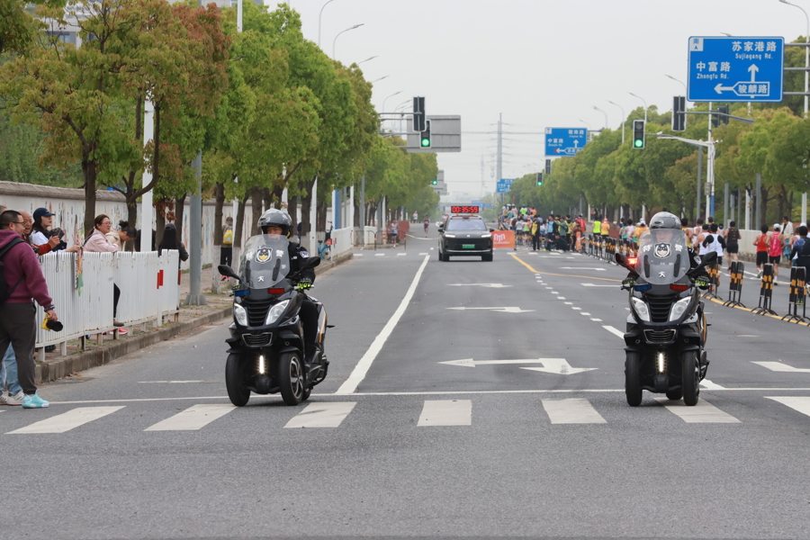 随着发令枪响,闵行特警驾驶警用三轮摩托车率先出发开道,全程伴随参赛队伍,实时关注路面情况。赛道上跑者挥汗如雨,赛道上方,闵行警方启用“警用无人机巡线”模式,两架具备喊话功能的无人机沿比赛路线往复飞行,实时回传画面至现场指挥部。